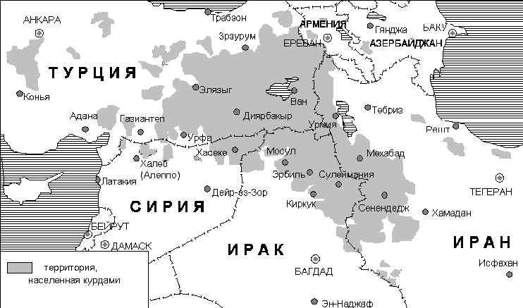Какая же территория является предметом этих драматических событий? Курдистан — это исторический район, расположенный на стыке Армянского и Иранского нагорий, с крайне запутанным рисунком горных хребтов и межгорных котловин. Основная часть территории Курдистана входит в состав Турции, Ирака, Ирана, меньшая захватывает Сирию и Армению. Из всех этих стран только Иран признает за частью этого географического пространства историческое название “Курдистан”.