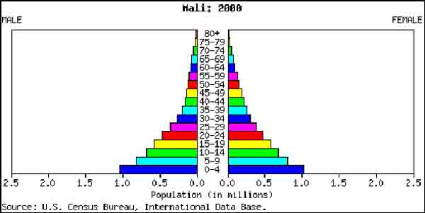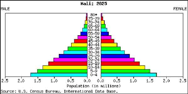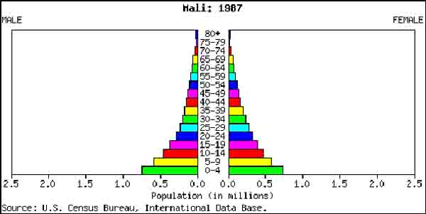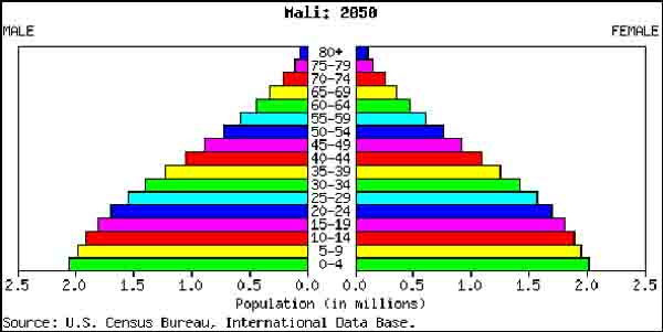 Через несколько секунд (в зависимости от быстроты вашего провайдера) вы получите на экране три пирамиды. Это классические пирамиды молодых развивающихся стран: с широкими основаниями (высокая рождаемость, многодетность) и стройными шпилями (вымирание людей в сравнительно молодых возрастах, редкое дожитие до глубокой старости). Из сопоставления трех пирамид видно, как ситуация будет постепенно меняться: рождаемость будет сокращаться, а люди будут жить подольше, и приземленно-заостренная пирамида будет понемногу становиться компактнее, вогнутые ее бока приобретут выпуклость. Но в целом, полагает американское Бюро переписей, малийцы будут продолжать неумеренно плодиться и население будет расти и расти, по крайней мере до середины текущего века. И общая площадь пирамиды на графике, заметим, будет все больше и больше.