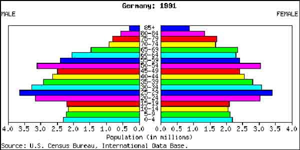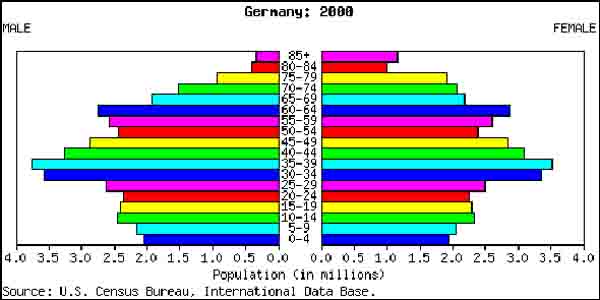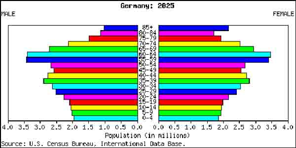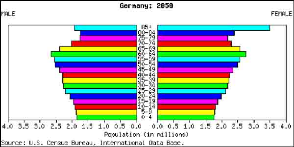 Теперь вытащим из памяти американского сервера какую-нибудь страну, уже сравнительно давно завершившую демографический переход. Находим в рамке Germany (найти несложно, благо не Deutsсhland). Германская пирамида 2000 г. в общих чертах (середина шире, чем основание и верхушка) похожа на кенийскую 2025 г., только значительно сложнее. Бросается в глаза сильный перекос в сторону женщин среди стариков (военные потери плюс меньшая продолжительность жизни мужчин). Сильное выпирание 30-летних когорт отчасти связано с иммиграцией в страну трудоспособных иностранных рабочих. Хорошо видно, что через полвека германская пирамида «перевернется с ног на голову», станет скорее воронкой или волчком, чем пирамидой. Каждая старшая возрастная когорта (до 60 лет) будет более многочисленной, чем последующая. По-видимому, Бюро переписей полагает, что иммиграция в страну прекратится. Практически исчезнет и половой дисбаланс. Лишь очень-очень старые фрау будут многочисленнее, чем очень-очень старые герры.