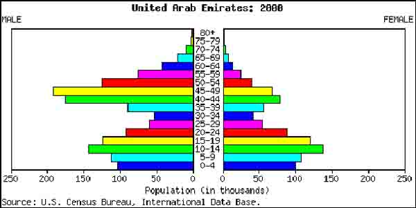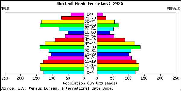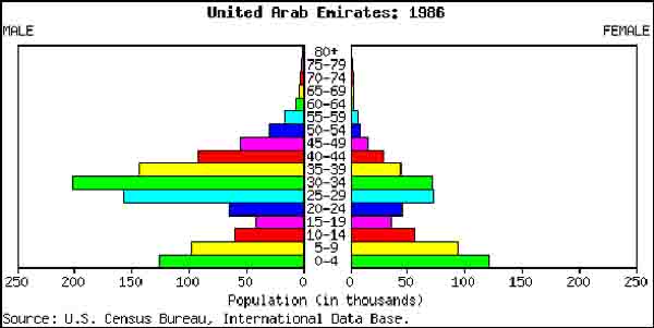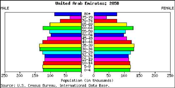 Массовая трудовая иммиграция (главным образом мужская) сильно обезобразила пирамиду Объединенных Арабских Эмиратов (United Arab Emirates). Ясно виден вывих левого бедра. Прогнозисты Бюро переписей полагают, что в дальнейшем ОАЭ не будут ввозить иностранную рабочую силу и по мере вымирания когорты 40—50-летних иностранцев (главный приток 20—30-летних иммигрантов был в конце 70-х и в 80-е годы как результат «нефтяного бума»; они-то и стали теперь 40—50-летними) пирамида будет все более сбалансированной и компактной. А к 2050 г. (страна богатая, медицина хорошая, продолжительность жизни высокая) демографическая пирамида в ОАЭ станет уже почти как германская (только старых фрау в чадрах будет поменьше).